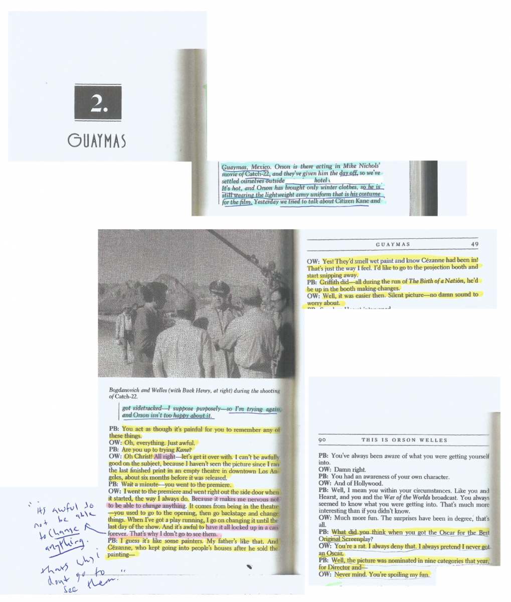 I decided to work like this because it allowed me to better edit the text, and in a way that was, to me, freer than writing a more traditional script. It was also easier to annotate the extracts in this way. Once I decided that my 'script' was cohesive enough, I started working on how to communicate the information in a way that wasn't visually uninteresting.