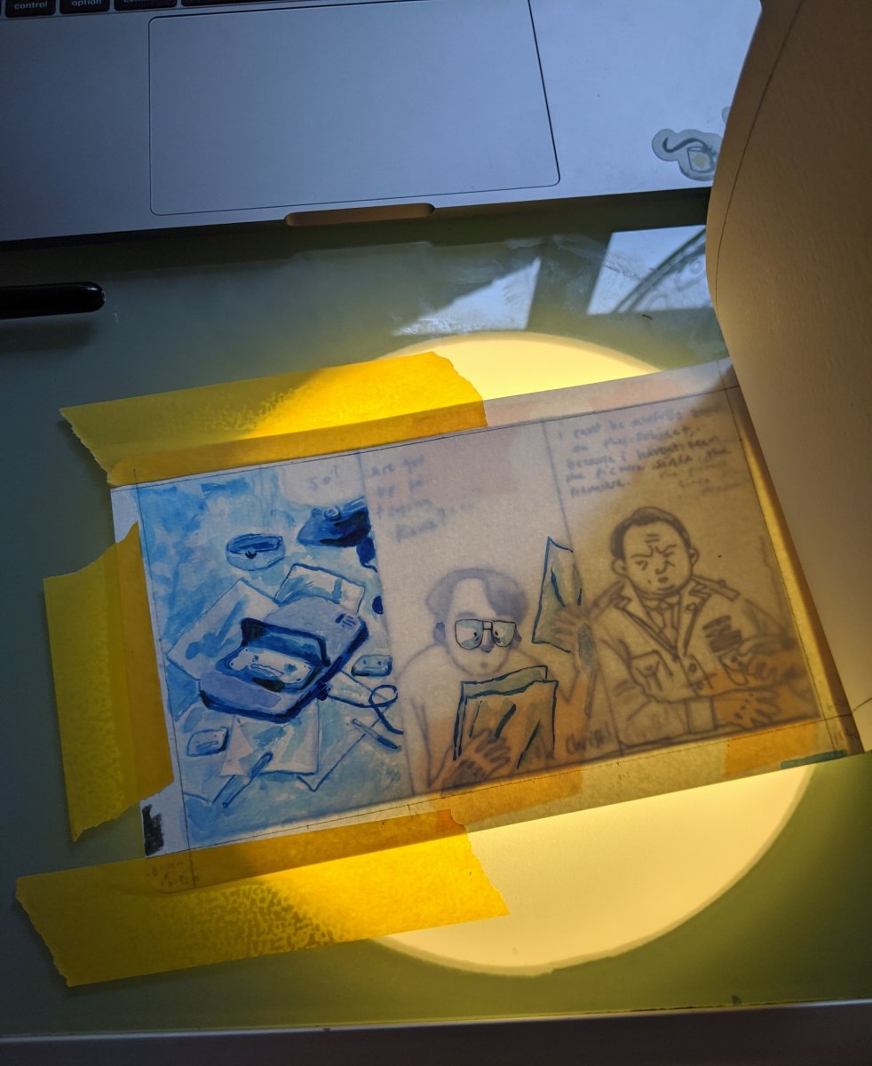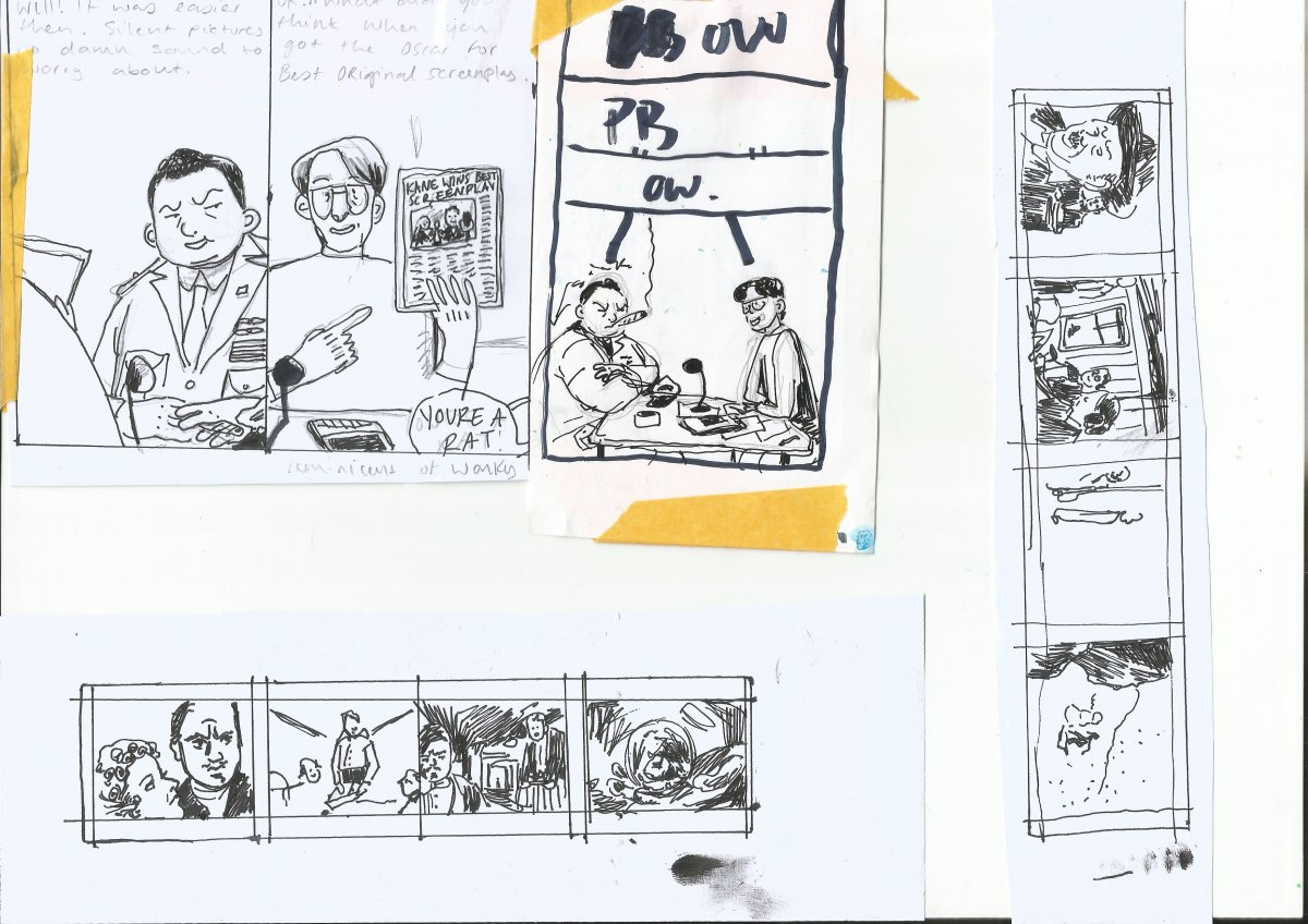 After deciding the method in which I wanted to work, which was using a light-box to paint the comic panels using watercolour and ink, I needed to create a more definite draft for the comic. I focused more on dialogue placement here, I thought more about where a reader would naturally expect the next speech-bubble to be. For the method I chose, the style of drawing had to be more simplistic, because the more detail the less-successful painting over a light-box would be. On the second page of comic panel sketches, there are also for the film negative panels. These panels have a more uniform, regular panel placement, the reason for this was in my earlier drafts I quickly realised that a messier, more irregular system of panel placement was not practical, looked worse, and was not as clear.