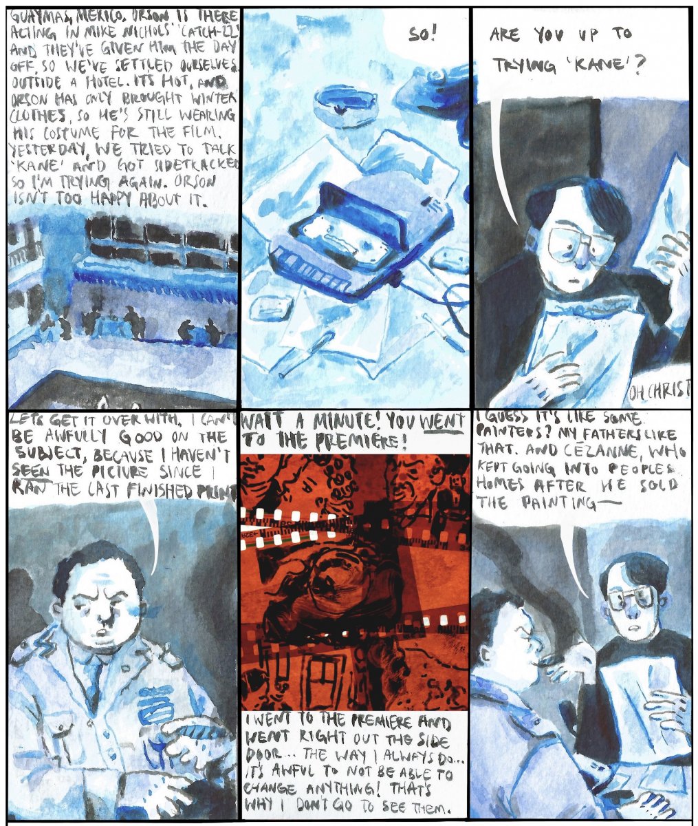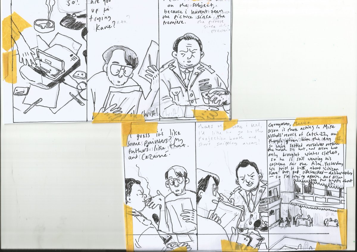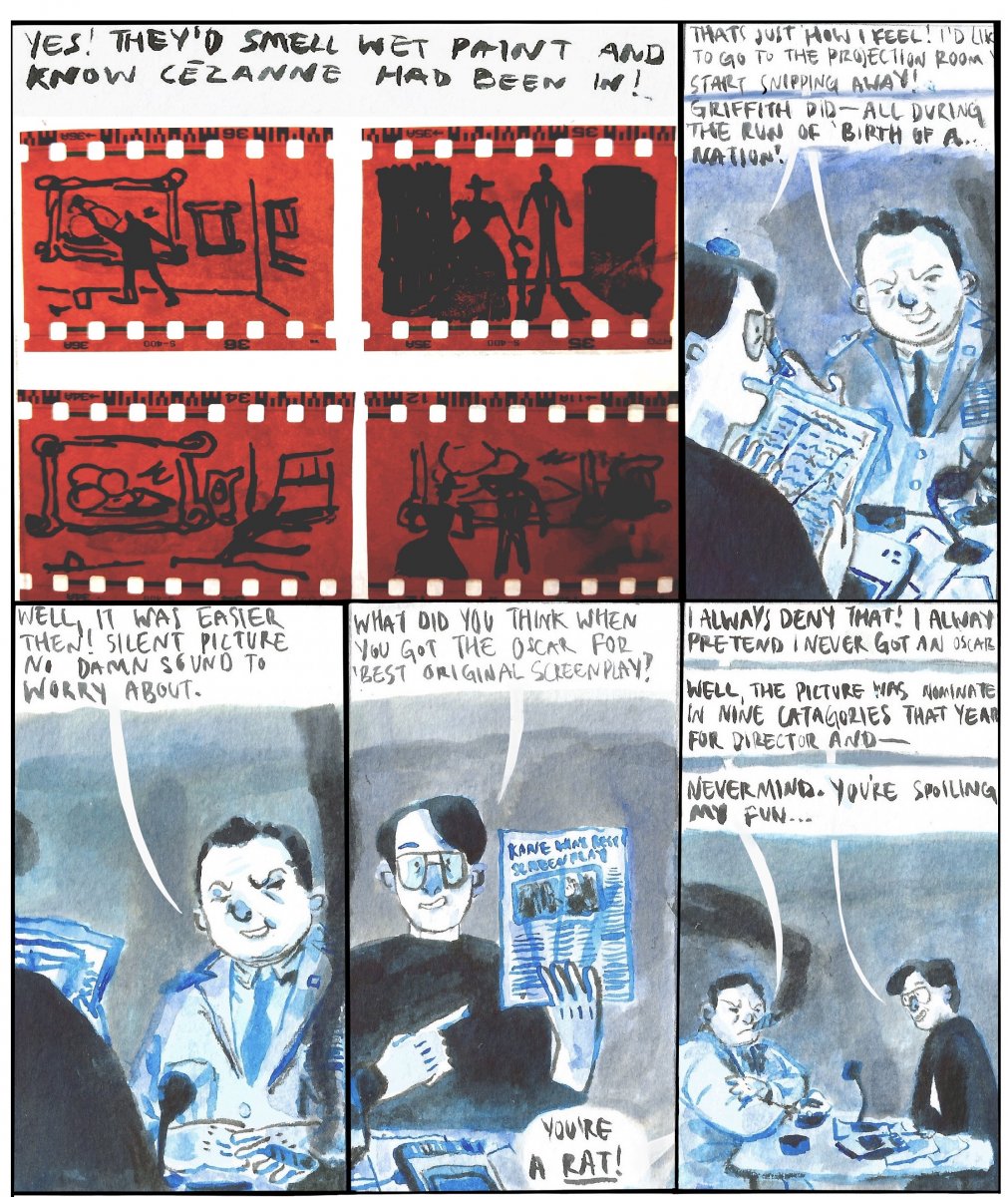 This is the final outcome for the comic, after being compiled (and slightly edited) in photoshop. The dialogue has been painted on the comic panels, and the film negative panels have been added.