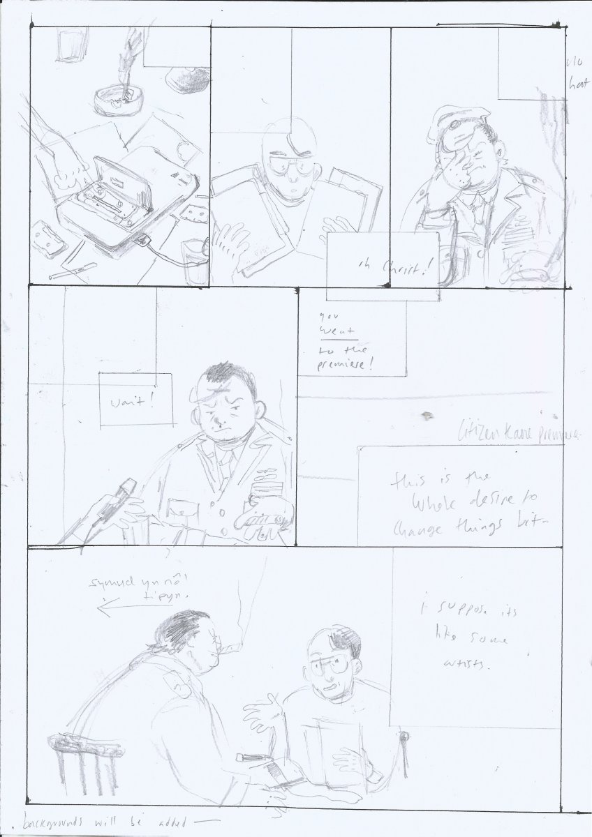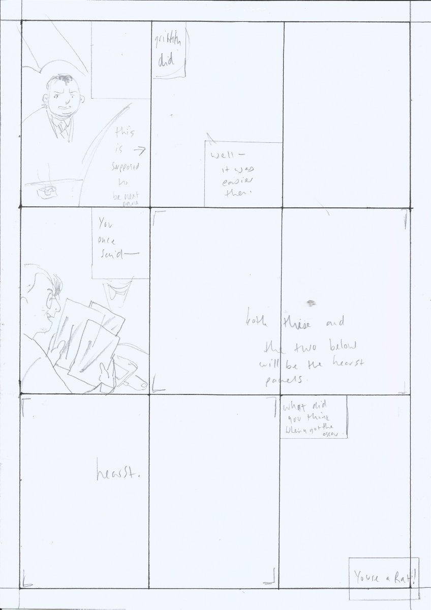 This is the final draft of my initial plan for the comic, it contains allotted areas for dialogue, and a plan for how to utilise the film negatives. Due to restrictions of the method I decided to use, I reverted to a more simplistic style, and approach to this draft, I intended for most of the detail work to be done whilst painting the panels, rather than methodically planned in advance.